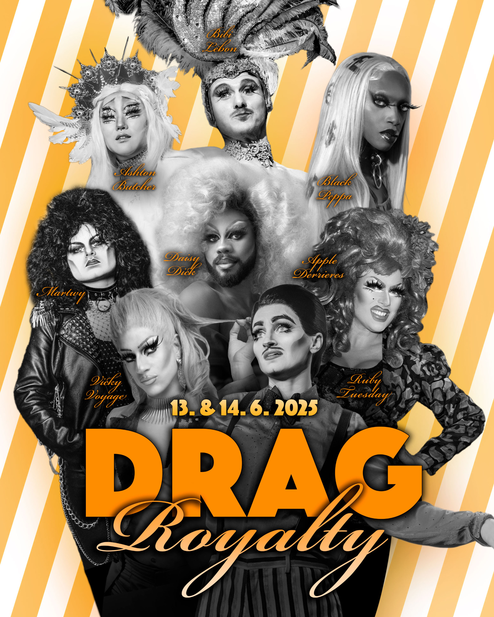 Betty Pearl grüßt und jodelt aus den Tiroler Alpen, Barbie Q nimmt euch mit zu ihren bolivianischen Wurzeln, Leila Yarn bringt mit ihrem italienischen Temperament die Bühne zum Glühen, Perry Stroika hat die Realität satt und entführt euch kurzerhand in seine eigene, Drag Quing Ryan Stecken lässt mit seiner Stimme Grenzen verschwimmen, Janisha Jones beginnt einen Ausflug in andere Galaxien und Ruby Tuesday fegt wie ein Orkan allerorts bestehende Geschlechterrollen hinfort.